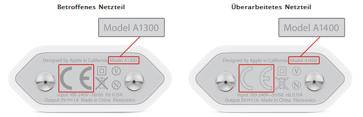 Um festzustellen ob das eigene USB-Netzteil von dem Produktionsfehler betroffen ist, reicht ein Blick auf die Unterseite des Netzteils mit den Kontaktstiften für die Steckdose laut Apple. Wenn die CE-Kennzeichnung komplett grau ist und auf der Unterseite die Modellnummer A1300 steht, dann handelt es sich um eines der fehlerhaften USB-Netzteile. Wenn die CE-Kennzeichnung lediglich grau umrandet ist und die Modellnummer A1400 aufgedruckt ist, dann handelt es sich bereits um die fehlerbereinigte Revision des iPhone-Netzteils.