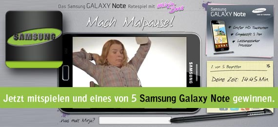 Dies macht sich auch Mirja Boes unter dem Motto „Mach Malpause!“ in dem Gewinnspiel zu Nutze, denn um an ein Galaxy Note heran zu kommen müsst ihr bei einem interaktiven Spiel auf YouTube erraten was Mirja denn da auf dem Galaxy Note malt.
