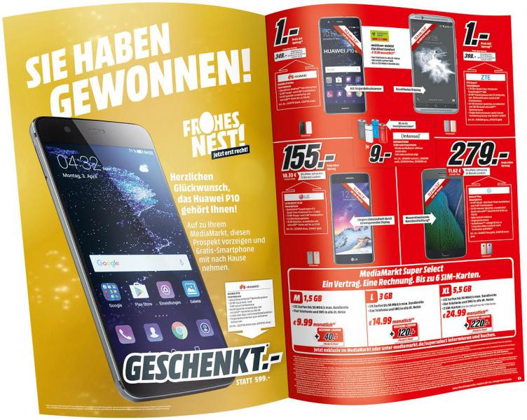 - Bis zum 29. April 2017 den vollständigen und unversehrten Prospekt in der nächsten Media Markt Filiale vorzeigen und gegen ein nagelneues Huawei P10 eintauschen.
