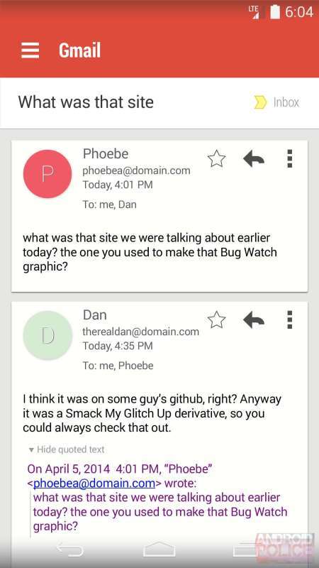 Google versucht mit Project Hera für die nächste größere Android-Version, vermutlich Android 5.0 Lollipop, die Nutzererfahrung für einzelne Apps auf das Web auszudehnen. Die Kollegen stellen für Project Hera den Vergleich mit der Webversion von Gmail an. Registriert man sich auf einer Website einer Online-Community, dann erhält man in Gmail eine Bestätigungsanfrage per E-Mail für die Registrierung. Google bzw. Gmail erkennt solche E-Mails mit einer Bestätigungsanfrage und platziert neben dieser Mail einen Button zur Bestätigung, ohne das die betreffende E-Mail geöffnet werden muss.