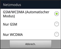 Menü/Einstellungen/Drahtlos und Netzwerke/Mobile Netzwerke/Netzmodus/Nur WCDMA oder GSM/WCDMA (Automatischer Modus)