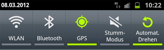 Bei GPS – das in der Regel zur Positionsbestimmung benötigt wird, scheiden sich die Geister. Unsere Überzeugung ist anDROID so gut programmiert, dass es trotz eingeschaltetem GPS dieses nur nach Bedarf nutzt und so auch Energie benötigt. Im Grunde zeigt ein Icon in der Taskleiste die aktive und so Ressourcen raubende Aktivität von GPS an.