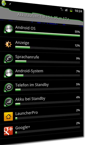 Wheres my Droid Power zeigt uns dann noch ein wenig umfassender als es die serienmäßige Akkuverbrauchsanzeige schon tut, welche Applikationen prozentual wie viel Strom verbrauchen um so gezielt die Übertäter zu identifizieren und eliminieren.