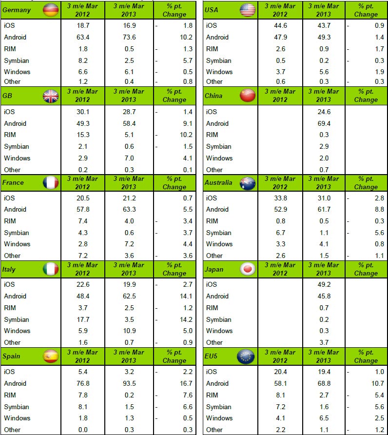 Weltweit gesehen liegt der Marktanteil von Android sogar relativ konstant bei über 60%, lediglich in Amerika und Japan kann Apples iOS der übermächtigen Konkurrenz noch etwas entgegensetzen. Mit 43,7% für iOS und 49,3% für Android geht der Wettkampf der beiden Plattformen denkbar knapp aus, im Heimatland kann iOS also doch noch sich behaupten, trotz leichtem Rückgang von 0,9%. Ganz im Gegensatz zu Japan, wo Apples iGeräte mit 49,2% die Android-Anteile von 45,8% sogar überholen konnte. Man könnte fast sagen, dass Japan die letzte große Bastion für Apple geworden ist, wo mal nicht die Konkurrenz teils sehr deutlich die Nase vorn hat. Interessant dürften daher die Zahlen werden, die erstmals die neuen Flaggschiffe von HTC und Samsung mit berücksichtigen. Denn gerade Samsung will allein vom Galaxy S4 dieses Jahr 80 Millionen Geräte absetzen.