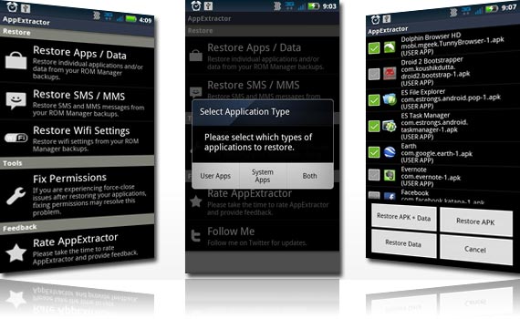 Hin und wieder macht der geneigte Poweruser von seinem Androiden ein Backup, um eine neue ROM auszuprobieren oder was anderes „gefährliches“ zu machen. Nicht selten vergisst man aber nach/vor dem Nandroid-Backup via ClockWorkMod auch seine Apps und andere wichtige Daten zu sichern. Abhilfe schafft hier jetzt AppExtractor, welches aus einem Nandroid-Backup Apps, SMS, MMS und andere Daten wiederherstellen kann.