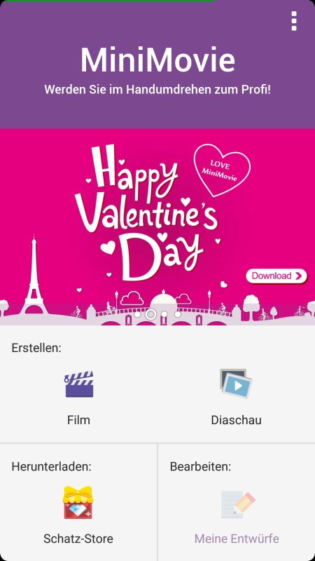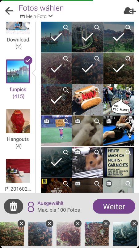 Nach dem Start sieht man zunächst das Hauptmenü. Im oberen Drittel wird bei bestehender Internetverbindung Werbung für neue Vorlagen gemacht, aber das nur am Rande. Interessant ist der Button „Film“, denn damit wird das Erstellen der kleinen Filme gestartet. Bis zu 100 Bildern lassen sich auswählen, die nicht zwingend in denselben Ordnern gespeichert sein müssen. Selbst Cloud-Speicher wird unterstützt – allerdings nur Google Drive und Facebook.