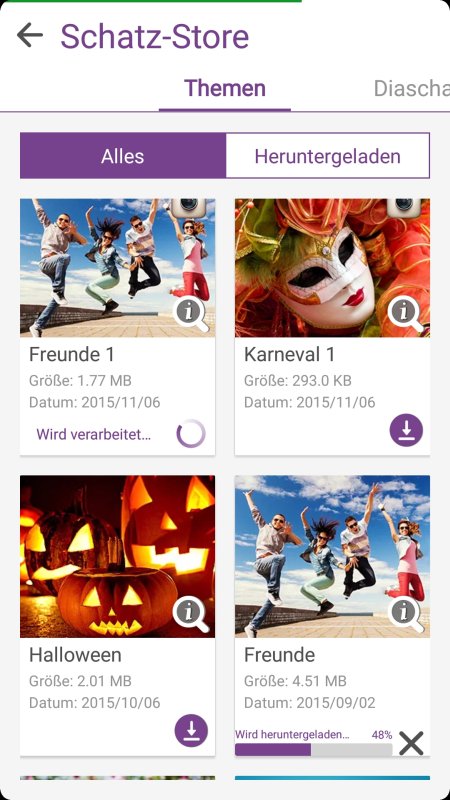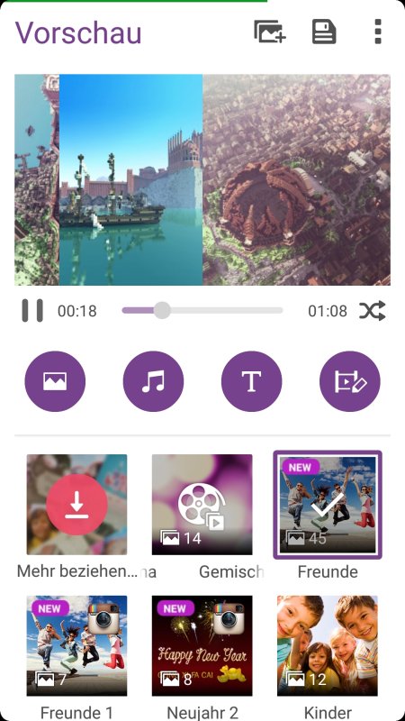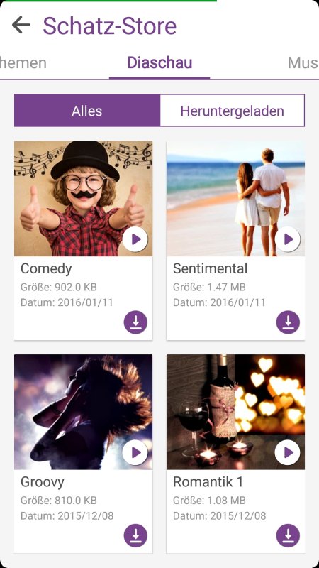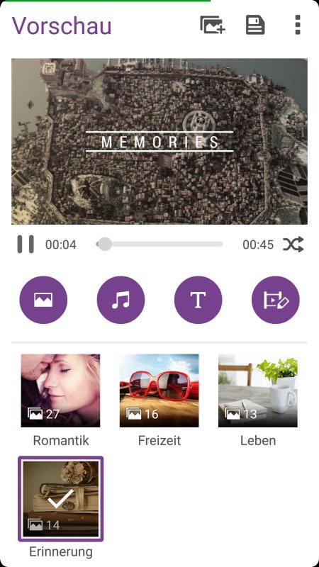 Ganz ähnlich funktioniert auch das Erstellen einer klassischen Diashow, wobei in diesem Fall komplette Vorlagen zum Einsatz kommen. Sprich, neben thematischer Musik zeichnen sich die Vorlagen durch individuelle Animationen bei den Übergängen zwischen den einzelnen Bildern aus, die man nicht beeinflussen kann. Einzig die Hintergrundmusik kann man analog zum Erstellen eines Videos auswählen sowie bearbeiten. Dasselbe gilt auch für zusätzliche Textelemente.