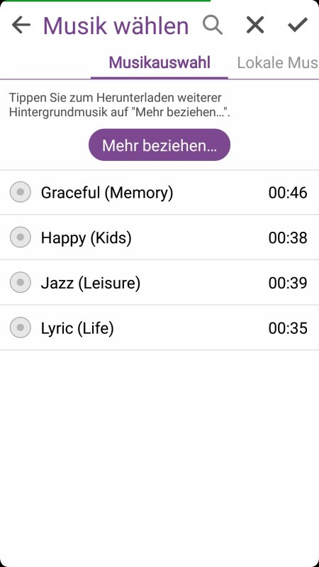 Ähnlich umfangreich ist der Audio-Editor zur Musikuntermalung. Entweder man begnügt sich mit der Musik der Vorlage – oder man nimmt einen Titel aus der eigenen Musikbibliothek. Zu beachten ist dabei, dass sich nur ein Titel auswählen und auch schneiden lässt. Mehrere Titel für Minutenlange Videos werden nicht unterstützt, was an der letztlich doch begrenzten Leistungsfähigkeit moderner Smartphones liegt.