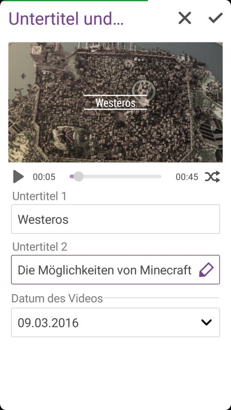 Etwas weniger Möglichkeiten bietet der Texteditor. Nicht selbstverständlich ist hierbei die Möglichkeit, vorgefertigte Elemente einer Vorlage wie Untertitel zumindest im Bezug auf den Text zu verändern. Je nach Vorlage kann man auch Angaben zum Datum anpassen.