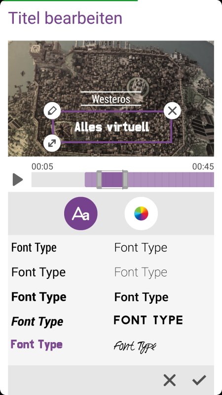 Wem das nicht reicht, der kann auch zusätzliche Textelemente in das Video über den vierten und letzten Button unterhalb der Vorschau einbauen. Über die Zeitleiste ist das Navigieren zur richtigen Stelle innerhalb des Videos ein Kinderspiel. Beeinflussen kann man allerdings nur die Textfarbe – vorgefertigte Farben oder über eine umfangreichere Farbpalette – und die Schriftart. Effekte wie Einblenden/Ausblenden, sich drehen und dergleichen wird jedoch nicht unterstützt. Zu beachten ist, dass für einen Textbaustein mindestens 3 Sekunden Zeit für die Animation benötigt werden. Wenn man die Zeitleiste auf das zusätzlich hinzugefügte Textelement bewegt, kann man über den Button dieses auch noch nachträglich anpassen.