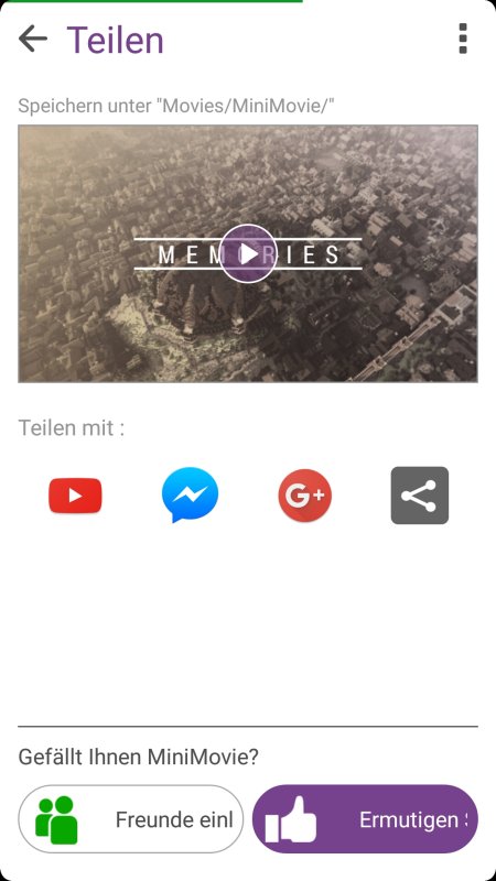 Nach Fertigstellung des Exports kann man das erstellte Video direkt aus der ASUS MiniMovie Diashow App heraus teilen. Dafür stehen neben YouTube auch Google+ und der Facebook Manager zur Auswahl. Über das Android-eigene Teilen-Menü ist man auf diese drei Apps allerdings nicht beschränkt.