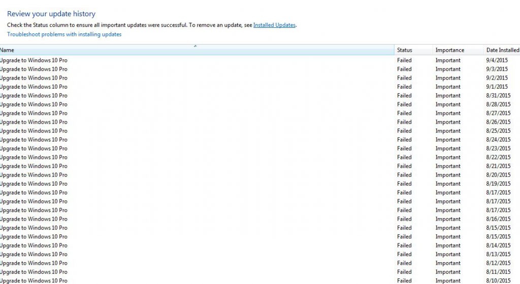 Einer der Forbes-Leser übermittelte sogar einen Screenshot der belegt, dass Windows 10 ganze 31 Mal versuchte sich zu installieren. Um selbst zu überprüfen, ob die unerwünschte Installation versucht wurde, muss man lediglich über Start -> Windows Update den Update-Dienst starten und im linken Panel des erscheinenden Fensters auf „Updateverlauf“ klicken. Dort sieht man, ob sich Windows 10 versuchte automatisch und ohne das Wissen des Nutzers zu installieren.