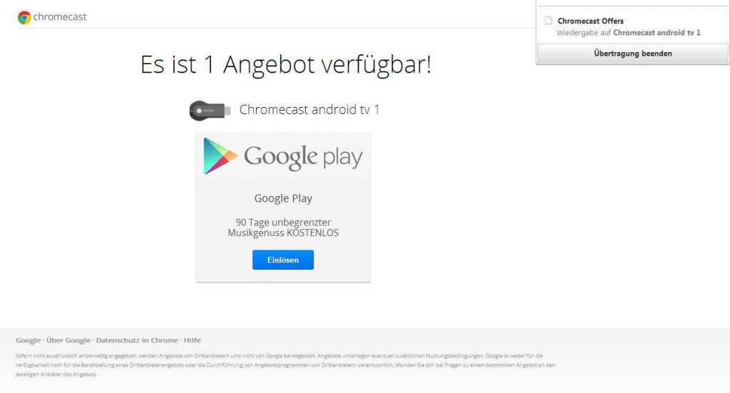 Denn hierzulande bekommt JEDER Käufer des Chromecast eben dieses Angebot, vorausgesetzt man hat nicht schon einmal den Dienst Google Play Music All Access (bzw. Google Play Music All-Inclusive wie es in Deutschland genannt wird) in Anspruch genommen.