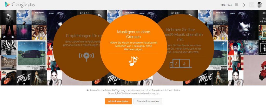 Ist das eigene Google-Konto legitimiert für den erweiterten Testzeitraum, dann stehen statt der sonst bereits erwähnten 30 Tage wie gesagt die 90 Tage zur Verfügung. Nach diesem Zeitraum kostet der Zugriff auf den Musikkatalog von Google Play Music All Access 9,99 Euro im Monat. Aber Achtung: Das Abonnement wird automatisch verlängert. Wer also innerhalb der 90 Tage nicht zufrieden ist mit dem Angebot muss es selbst wieder kündigen!