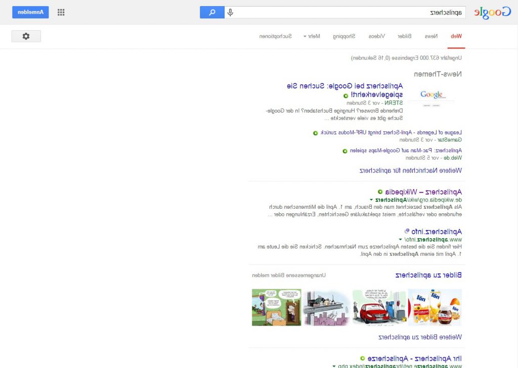 Dabei hat es Google aber nicht gelassen, denn eine ganz besondere Sache gibt es noch: Die Spiegel-verkehrte Google-Suche! Unter com.google kann man sich heute mal alles spiegelverkehrt anzeigen lassen. Nicht nur das Logo und der Test sind verkehrt herum, sondern auch Buttons, Suchergebnisse, Werbung und alles andere, was man sonst noch so auf der Google-Suche anstellen kann. Der Spuk wird beendet, wenn man beispielsweise Gmail öffnet