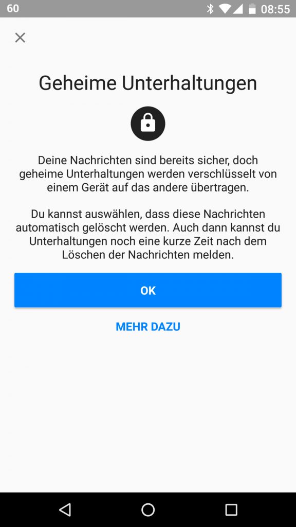 Wer also nun eine geheime Unterhaltung von Smartphone zu Smartphone führen möchte, findet bei der Eröffnung einer neuen Nachricht, neben dem Kontakt ganz oben rechts ein Schlosssymbol (Android) oder das Wort „Geheim“ (iOS). Wird die Unterhaltung nun gesichert, ändert sich das Design von Blau auf Schwarz.