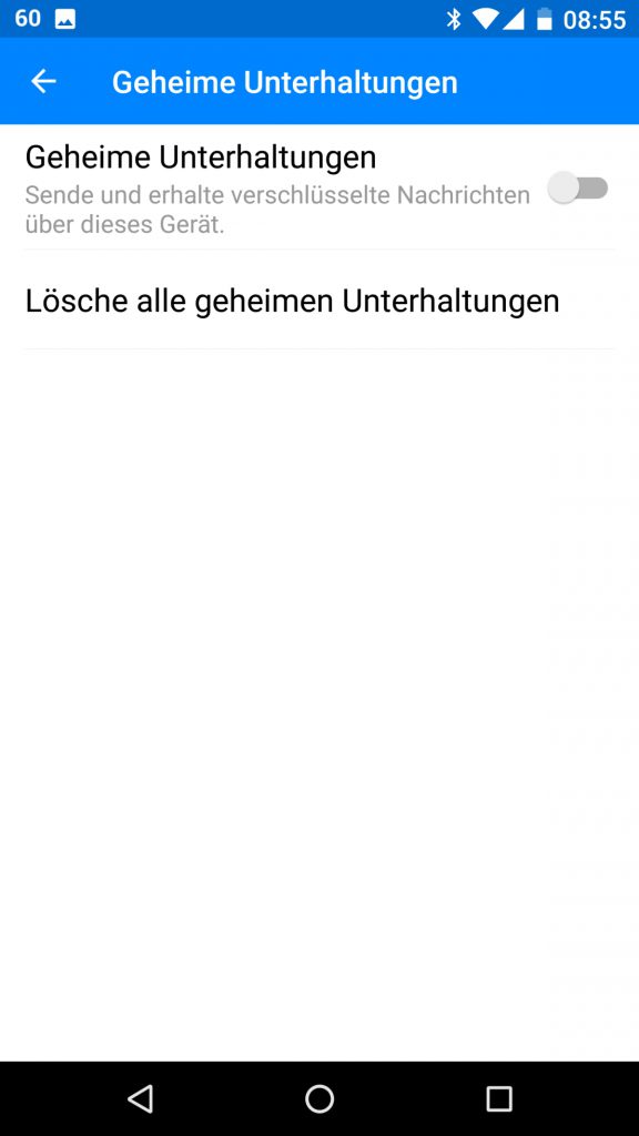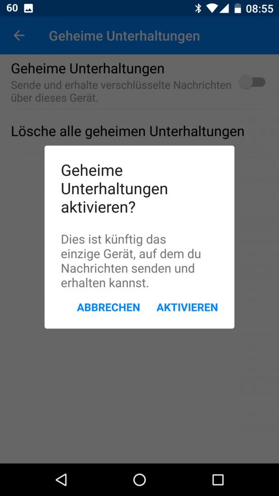 Dafür geht ihr auf eure Profileinstellungen und wählt den Menüpunkt „Geheime Unterhaltungen“. Dort muss nun die Option „Sende und erhalte verschlüsselte Nachrichten über dieses Gerät“ aktiviert werden.