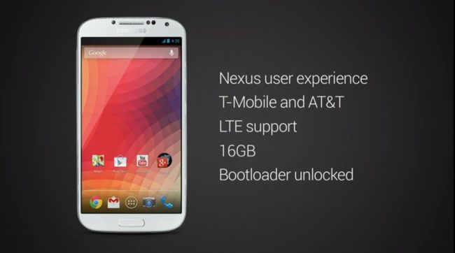 Derzeit ist das beste Nexus-Smartphone das Nexus 4 von LG, dass durchaus seine große Anzahl an Fans gefunden hat. 4,7″ HD-Display, Snapdragon S4 Pro und ganz vom Geiste Googles ausgefüllt. Eigentlich das perfekte Gerät, doch manche monieren den fest verbauten Akku, dass nicht mehr zeitgemäße Display und vor allem: Den nicht erweiterbaren Speicher. Google setzt halt voll auf die Cloud, da ist es nur konsequent, beim eigenen Smartphone auf die Speichererweiterung zu verzichten. Dennoch mehren sich die Stimmen, die lieber ein Top-aktuelles Smartphone mit der Google-Liebe hätten. Sowas wie das Galaxy S4 von Samsung beispielsweise, dass mit 4,99″ FullHD Super AMOLED Display, Snapdragon S600 und so weiter protzt. Tja, ihr lieben, was soll ich euch sagen? Samsung hat euch erhört.
