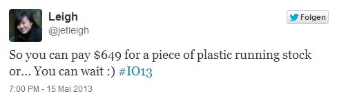 Für einen kurzen Moment der Aufregung sorgte dann HTC gestern Abend direkt nach der Vorstellung des Galaxy S4 in der Google Edition. HTC-Mitarbeiterin Leigh Momii twitterte, dass man 649 US Dollar für ein Stück Plastik mit Stock Android ausgeben könne oder aber noch ein wenig abwarten. Kein Wunder das viele HTC-Fans daraufhin eine Antwort von HTC auf das Vorhaben Samsungs. Nichts weiteres als ein HTC One „Nexus Edition“ machte die Runde durch das Netz.