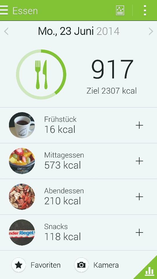 Was am Anfang ein wenig Zeit intensiv war, hat sich nach ein paar Favoriten anlegen inklusive meinem kleinen Foto-Nahrungsalbum, schnell auf wenige Minuten am Tag reduziert. In der Tat war ich auch sehr überrascht, wie vollständig die App mit „deutschen“ Produkten gefüllt ist. Damit meine ich jetzt nicht typisch „deutsche“ Lebensmittel wie Kartoffeln und Sauerkraut, sondern wie bei dem Beispiel Vollkornbrot, wird dieses gleich mehrfach von unterschiedlichen Bäckereien und Lebensmittelketten angeboten. Nicht das dies viel in der Kalorienanzahl ausmachen würde, aber ein sicheres Gefühl gibt es dennoch.