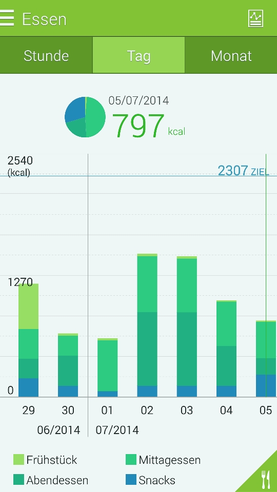 Was sich wie schon gesagt kurz nach dem Interview als unlösbare Aufgabe angehört hatte, erwies sich nach kurzer Eingewöhnung und einem gezielten Blick auf Zucker, Fett und Kohlenhydrate, zu einer Sache die einfach in Fleisch und Blut überging. Man bekommt schnell ein Gespür dafür was ein absolutes no go ist, was „mal“ geht und was gefahrlos gegessen beziehungsweise getrunken werden kann. Das Ganze wird mir dann auch schön übersichtlich in der S-Health Anwendung für den Tag angezeigt wie viel kcal denn noch drin sind, sodass ich mir eigentlich fast jeden Tag noch einen leckeren Kinderschokoladenriegel (21g = 118kcal) genehmigen durfte.