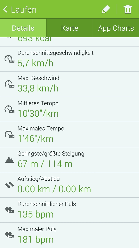 Das Laufbandtraining viel mir erstaunlicherweise relativ leicht, da hatte ich eigentlich die meiste Sorge vor mangelnder Kondition. Doch mit der Samsung Gear 2 startete ich voller Erwartung meine angestrebten 45 Minuten Training, welche diese mir dann auch sogleich den aktuellen Puls und die restlichen Trainingszeit anzeigte. Auf Basis dieser Anzeige konnte ich nun meine Geschwindigkeit im 15 Minuten Rhythmus von meinen 7,5 km/h und 5% Steigung, auf 2 – 3 Minuten bei 5 km/h reduzieren, um den Puls wieder auf 110 – 120 bpm (beats per minute) zu beruhigen, gegenüber meinem Spitzenpuls von 180 bpm. Grund hierfür ist nicht mit einer zu hohen Herzfrequenz zu laufen, da man dadurch eher die Ausdauer trainiert, anstelle das unbequeme Fett zu verbrennen.