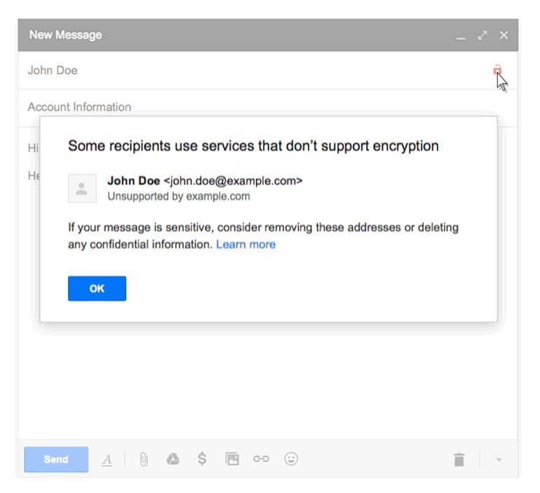 Über ein kleines rotes und geöffnetes Schloss signalisiert der Mail-Editor eine unsichere Verbindung, falls der Mail-Anbieter des Empfängers die als sicher geltende TLS-Verschlüsselung nicht unterstützt. Klickt man auf das Symbol, so erhält man als Nutzer einen kleinen Text mit Erklärungen, warum die Verbindung überhaupt von Google als unsicher eingestuft wird.