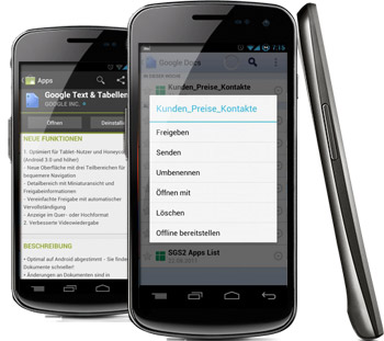 Mit dem letzten Update wurde der App für Android der Offlinezugriff auf Dokumente spendiert. Damit kann, ähnlich wie bei DropBox, eine Kopie des Dokumentes lokal gespeichert und editiert werden, um dann später per „Update“ auf den neusten Stand gebracht zu werden. So hätte die Handhabung eigentlich von Anfang an sein müssen, intuitiv und einfach.