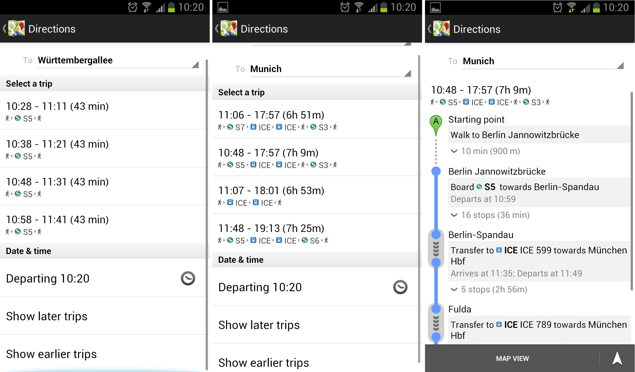 Seit heute morgen bietet Google Now neben den üblichen Vorschlägen einer Route zusätzlich S-Bahn-Verbindungen an, was durch die „Navigate“-Taste unterhalb der Übersicht zeigt. Mit einem kleinen Tipser auf eben jene Taste wird die Übersicht der möglichen Zugverbindungen angezeigt. Das Ganze funktioniert übrigens nicht nur in Google Now, auch vom mobilen Browser und dem Desktop Browser heraus funktioniert das Ganze bereits, wie unterer Screenshot zeigt. Das Einzige das jetzt wirklich noch zum absoluten Allround-Tool Google Maps fehlen würde, ist die Einbindung von örtlichen Verkehrsbetrieben. Quasi das, was derzeit Öffi macht: Fahrpläne regionaler Straßenbahn-, U-Bahn- und Busnetze bereitstellen, inklusive Abfahrtszeiten, Netzpläne, Endstationen und so weiter.