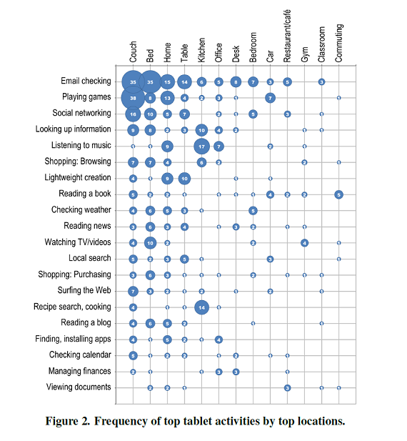 Erwartungsgemäß liegt die hauptsächliche Nutzung am Sofa, gefolgt vom Bett, generell Daheim, am Tisch, in der Küche usw. Unterwegs hat die Nutzung des Tablets offenbar noch weniger Stellenwert.
