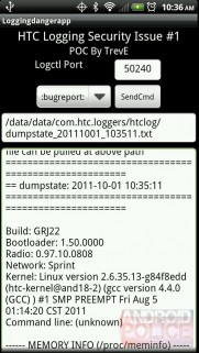 Man muss lediglich eine App mit dem Recht für android.permission.INTERNET ausstatten, quasi jede App fordert diese Rechte an, und schon kann man mit einem lokalen Port eine Verbindung zu dem HTC-Tool htclogger aufbauen und nahezu sämtliche persönlichen Daten auslesen lassen, wie zum Beispiel der GPS-Standort, SMS-Inhalte, System-Logs oder sogar Telefonnummern aus der Verlaufsliste.