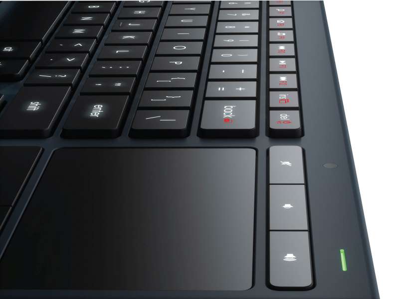 Und da ist nun mal eine Tastatur zur Texteingabe ungemein komfortabel. Logitech hat mit der Illuminated Keyboard K830 für genau diesen Einsatzzweck eine neue Tastatur im Angebot, welche wie der Name andeutet Tasten mit Hintergrundbeleuchtung besitzt. Neben den separaten Medientasten ist das Trackpad inklusive Maustasten eine weitere Besonderheit der Logitech Illuminated Keyboard K830. Bis zu 10 Meter weit reicht die Funkverbindung über den Unifying-Empfänger von Logitech, die auf dem 2,4-GHz-Band funktioniert. Die Beleuchtung der Tasten schaltet sich automatisch nach etwa 5 Sekunden aus und kann sich von der Intensität her dem Umgebungslicht anpassen, was für ein angenehmes schreiben selbst im abendlich-dunklen Wohnzimmer sorgen dürfte.