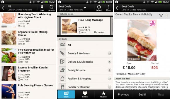 Nur was ist das eigentlich, HTC Best Deals? Nun, vereinfacht gesagt ist es ein Portal, über welches man sich von 12 Werbepartnern Rabattaktionen der näheren Umgebung anzeigen lassen kann. Einstellen lassen sich die persönlichen Vorlieben sowie Interessen einstellen, die Ergebnisse bzw. Treffer selber lassen sich ordnen. Dabei gibt es Sortiermöglichkeiten nach Beliebtheit, Rabatthöhe, Preis und Zeitraum für das Angebot. hat man ein Angebot gefunden das einem zusagt, kann das Angebot als Lesezeichen abgespeichert oder mit Freunden geteilt werden. Selbst Widget-Freunde können sich über ein Homescreen-Widget von HTC Best Deals freuen. Einziger Nachteil: Die App lässt sich nicht löschen, was sich vermutlich auf Nicht-gerootete Smartphones beziehen dürfte.