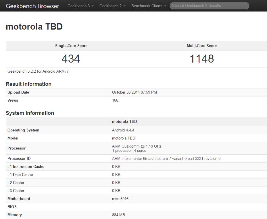 In der Datenbank des besagten Benchmarks ist ein bisher vollkommen unbekanntes Motorola-Smartphone aufgetaucht, zu welchem es neben den Ergebnissen zum Single-Core- und Multi-Core-Test lediglich Infos zum verbauten Prozessor gibt. So wird in dem noch namenlosen Android Smartphone ein Snapdragon 410 mit vier Kernen zu je maximal 1,2 GHz sein Werk verrichten, womit Motorola offiziell das Territorium der 64-Bit fähigen Smartphones betritt. Allerdings läuft auf dem Gerät noch Android 4.4.4 KitKat anstelle des 64-Bit fähigen Android 5.0 Lollipop. Angesichts der sehr schnellen Updates bei Motorola dürfte das jedoch nicht lange auf sich warten lassen.