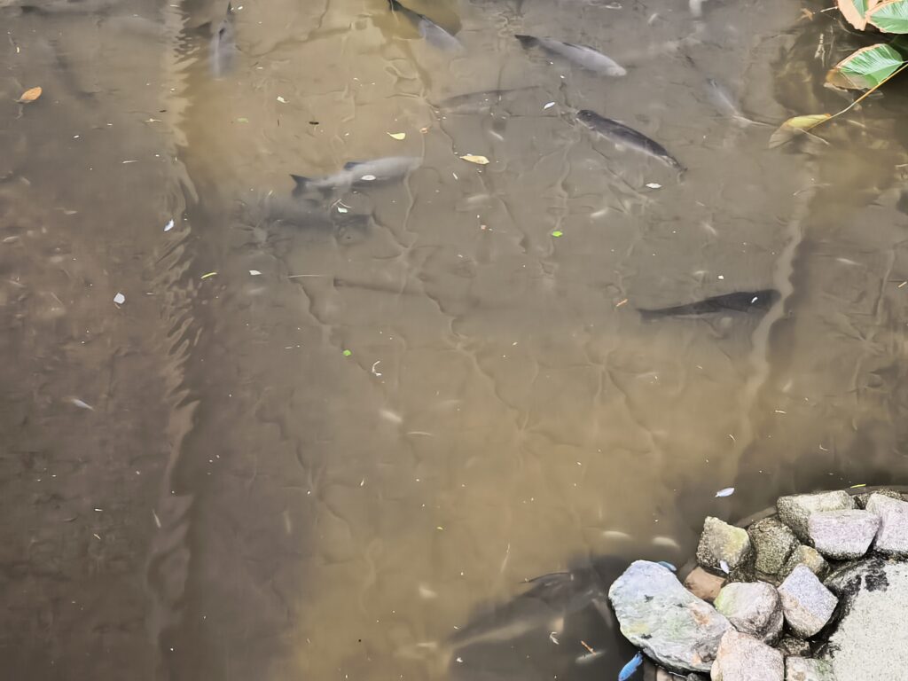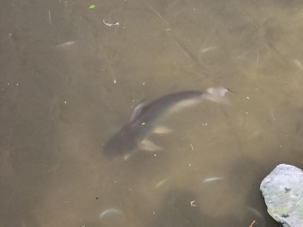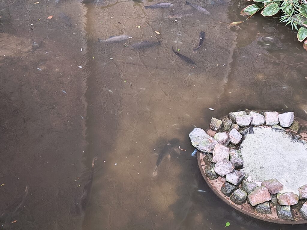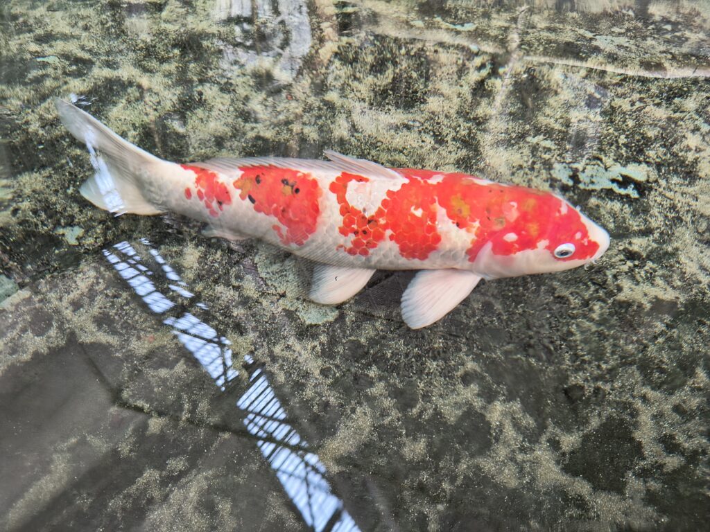 Bei dem japanischen Nishikigoi erkennt man sogar noch die einzelnen Schuppen, obwohl der Karpfen sich unter Wasser befindet.