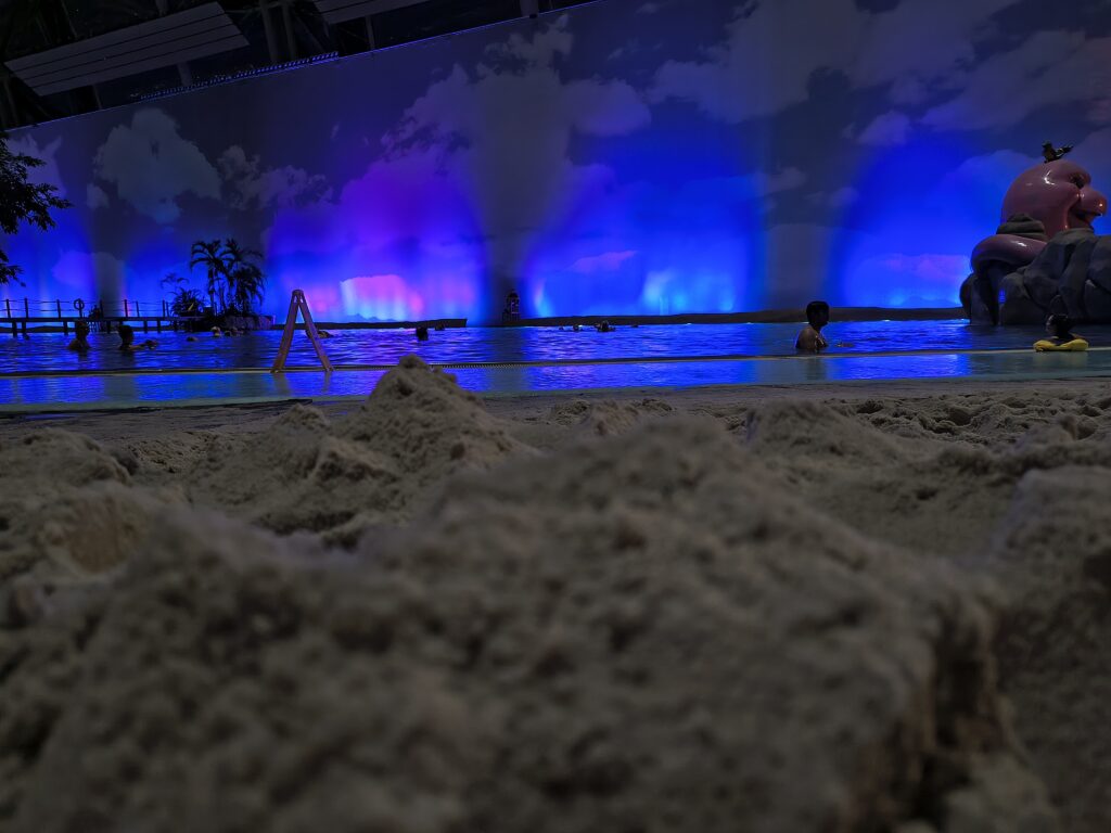 Wie bei anderen Kameras auch, wo nicht für die Weitwinkel- und Hauptkamera der gleiche Sensor verbaut wird, erkennt man schnell die Farbunterschiede. Das Beispielfoto mit der Rutsche, bzw. den Rettungsringen verdeutlicht diesen Eindruck beim Rotton und dem Himmel im Hintergrund der durch die Zeppelinhalle zu erkennen ist.