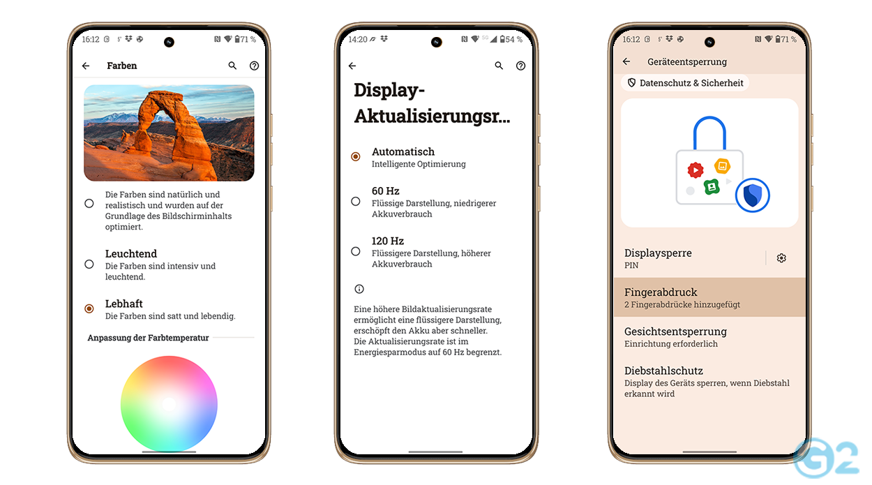 Das Display ist durch Corning Gorilla Glass 3 geschützt. Der Fingerabdrucksensor befindet sich ebenfalls unter dem Panel und arbeitete in unserem Test sehr schnell und zuverlässig. Face-Unlock gibt es aber auch als Entsperr-Option. Und ein weiterer Pluspunkt: Es gibt endlich ein Always-on-Display!