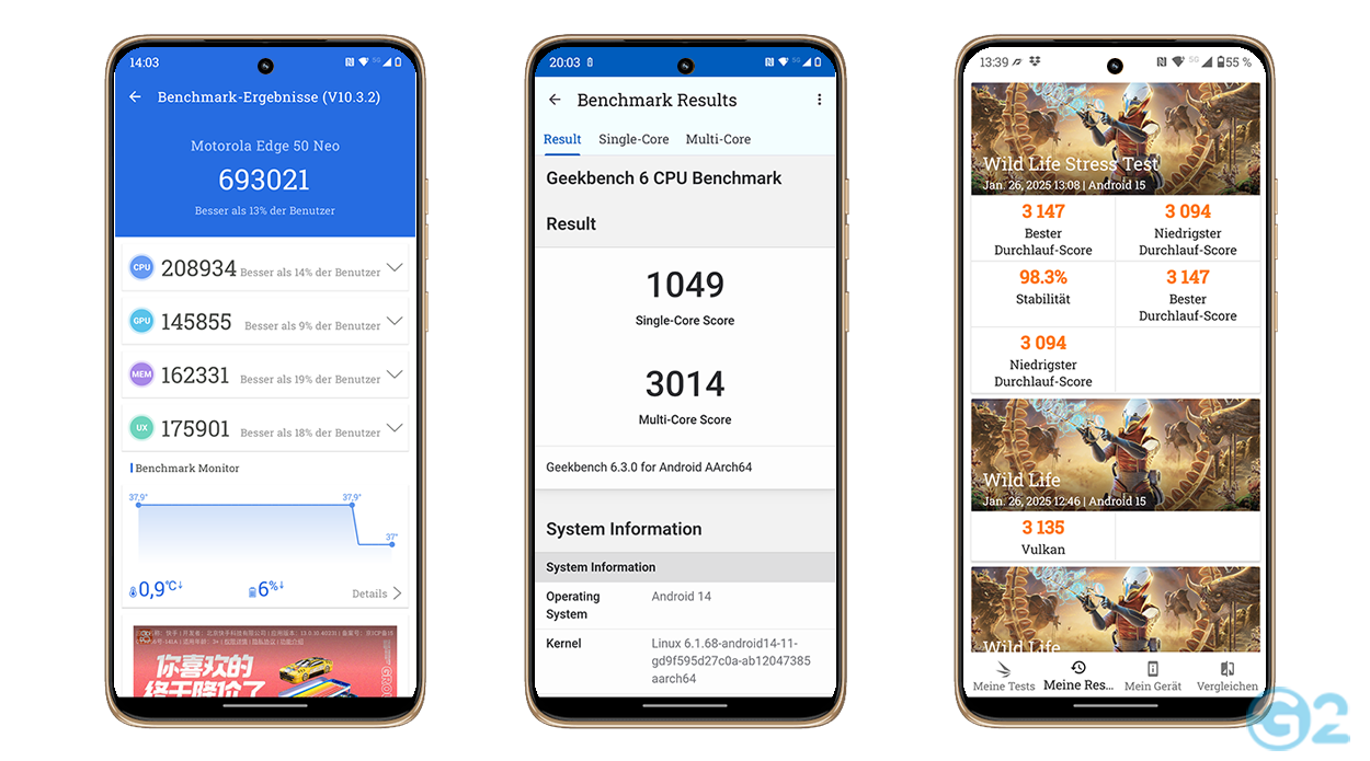 Während der AnTuTu mit einen Wert von 693.021 Punkte die Mittelklasse dokumentiert, werden es beim Geekbench 1.049 Single- und 3.014 Multi-Core-Punkte. Zum Vergleich ziehen wir einmal das Google Pixel 8a (zum Test) heran, was ich ebenfalls in der Mittelklasse verorten würde. Das packte unter Android 15 die 1.486 und 2.728 Punkte im Single- beziehungsweise Multi-Core-Score. Dafür, das Google den Processor auch in seinen Flaggschiffen verwendet ein recht gutes Ergebnis für den MediaTek-Prozessor, oder?