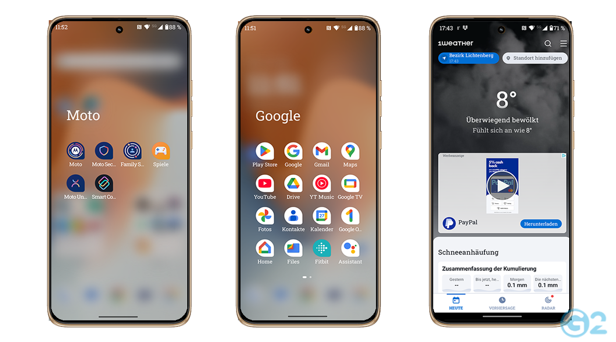 Die zweite Frage ist im Grunde genauso schnell zu beantworten: Bis auf Facebook, Booking.com, TikTok und LinkedIn gibt es keine Bloatware. Vielleicht würde ich noch die 1Weather-App benennen wollen. Sie ist wie auch bei anderen Smartphones nicht von Motorola, lässt sich aber aufgrund ihrer Systemeinbindung auf dem Start-als auch Lockscreen nicht so ohne weiteres löschen. Ich würde sie nicht zwingend als Bloatware bezeichnen, wenngleich die penetranten Werbeeinblendungen schon hart nerven.