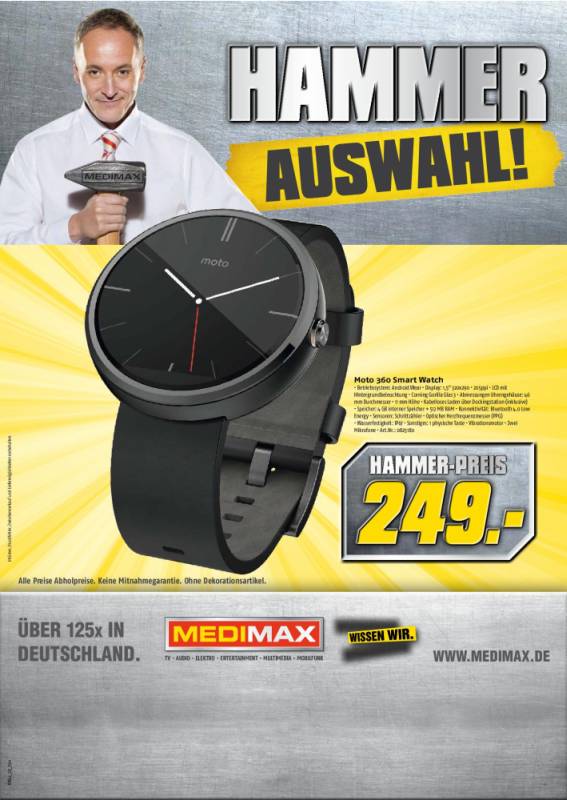 Während Media Markt und Saturn die Auslieferung der vorbestellten Motorola Moto 360 auf unbestimmte Zeit verschieben mussten (zum Beitrag), gibt es das silberne Modell dennoch zu kaufen. Der Elektronilkhändler MediMax ist aktuell der einzige Anbieter der SmartWatch mit dem kreisrunden Display, dass für eine sehr große Nachfrage gesorgt hat. Wer also 249 Euro hat, sich mit der silbernen Motorola Moto 360 anfreunden kann und einen MediMax in der Nähe hat, der kann die runde SmartWatch noch heute kaufen.