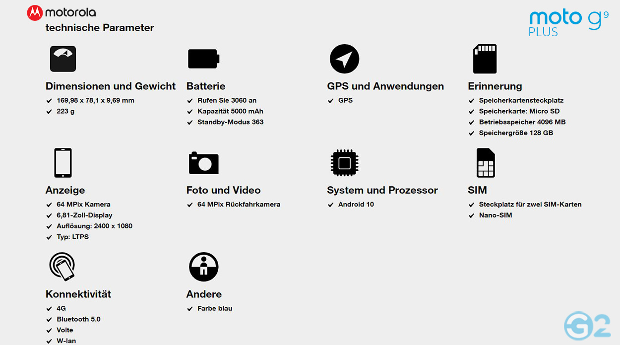 Über den Prozessor gibt Orange keine Auskunft. Aus früheren Leaks wissen wir aber von einem Snapdragon 665 Octa-Core-Prozessor. Diesem stehen 4 GB RAM und 128 GB erweiterbarer (microSD-Karte) Programmspeicher zur Seite. Auch hier findet in dem 169,98 x 78,1 x 9,69 Millimeter großen und 223 Gramm schweren ein 5.000 mAh starker Akku Platz. Anders als bei dem G9 Play befindet sich der Fingerabdrucksensor an der Seite. Über einen Audio-Klinkenanschluss verfügt das Motorola Moto G9 Plus ebenfalls.