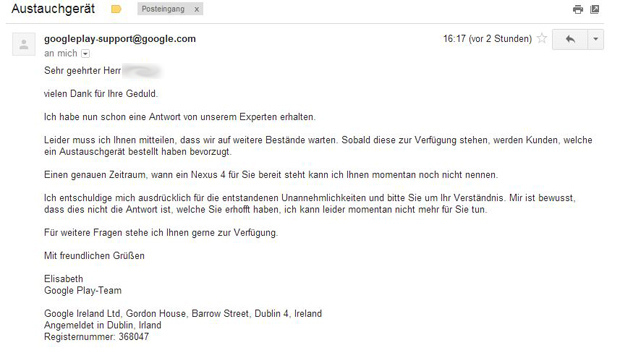 Und das zeigt sich langsam stärker denn je, wie ein sicherlich enttäuschter Nexus-4-Käufer selbst erleben musste. Da wollte besagter Kunde sein defektes Nexus 4 umtauschen lassen und dann wird daraus nichts. Kurz nach Weihnachten wird das defekte Gerät eingeschickt und gehofft, dass schnell das Austausch-Gerät eintrifft. Schließlich hat der Google-Support beteuert, dass ein Austauschgerät noch vorhanden sei. Nun im neuen Jahr hat sich noch immer nichts getan, kein Austausch-Nexus weit und breit.