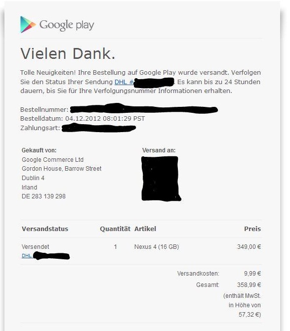 Und wie nicht anders zu erwarten, war gestern gegen 17 Uhr deutscher Zeit der Ansturm auf die Google-Server wieder riesig, was die Infrastruktur allerdings spürbar besser diesmal wegsteckte. Dennoch war das Nexus 4 recht schnell begrenzt, was mit der Anzeige von „Wird in 5 bis 6 Wochen versandt“ andeutet. Das 8 GB Modell ist sogar wieder ausverkauft. Wer gestern bestellt hatte und in der Bestätigungsmail einen Lieferzeitraum von 1 bis 2 Wochen bestätigt bekam, der könnte sich vielleicht freuen wie ein Schneekönig. Denn wie es aussieht, werden diese Bestellungen bereits verschickt und könnten im Idealfall bereits morgen vor der Haustür liegen.