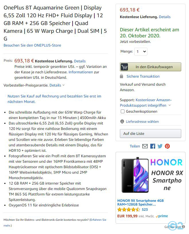 OnePlus 8T war kurzzeitig bei Amazon bestellbar