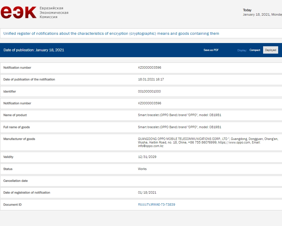 Die EEC (Eurasian Economic Commission) ist die Eurasische Wirtschaftskommission mit Sitz in Moskau. Die Hauptaufgabe besteht darin, das Funktionieren und die Entwicklung der EEU sicherzustellen. Hier wurde nun unter der Modelnummer „OB19B1“ die Zertifizierung des im Sommer 2020 in China präsentierten Oppo Band vorgenommen. Ein erster Schritt auf dem Weg nach Europa. Das Oppo Band ist baugleich mit dem kürzlich in Indien vorgestellten OnePlus Band, welches dort für 2.499 indische Rupien (umgerechnet 30 Euro) verkauft wird. Von Anfang an war zu vernehmen, dass der Fitnesstracker nicht in Europa erscheinen wird. Das hat vermutlich der Schwester-Konzern Oppo zum Anlass genommen, das eigene Oppo Band nun auch außerhalb von China zu verkaufen. Denn dort gibt es das smarte Band mit SpO2-Sensor, Schlaf-Tracking und NFC bereits seit dem Sommer 2020 für 199 Yuan, beziehungsweise 249 Yuan (Fashion Edition), was umgerechnet ebenfalls knapp 30 Euro ergeben.