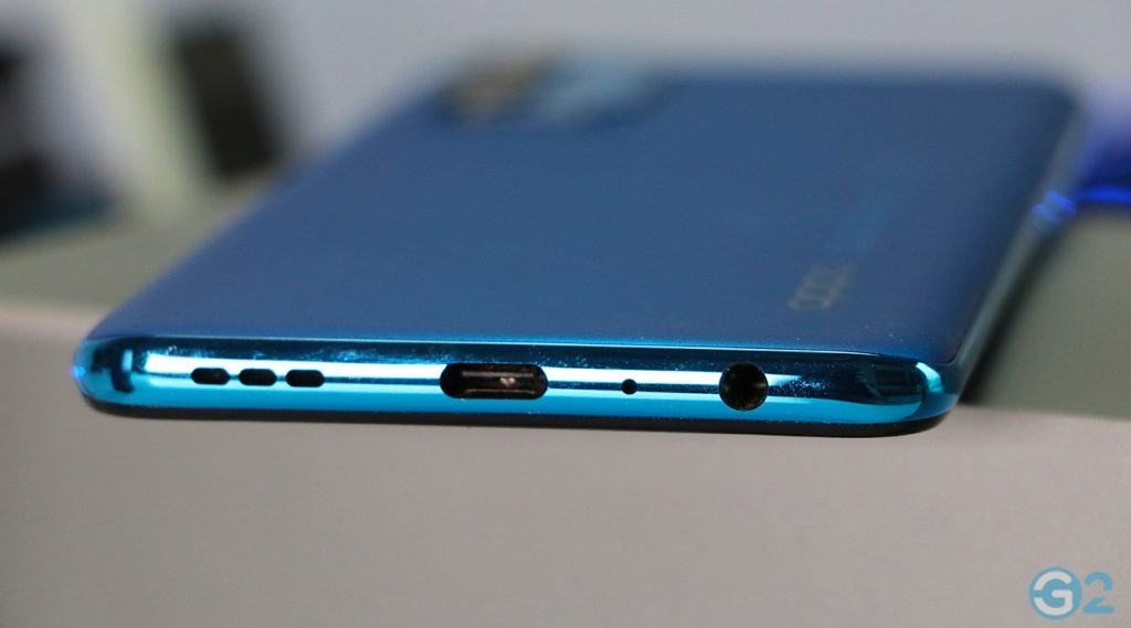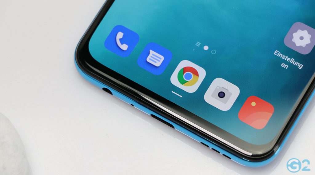 Auf der Rückseite gibt es oben links ein dezent aus dem Gehäuse ragendes Quad-Kamera-Array, welches aufgrund der drei vertikal angeordneten größeren Objektive den Eindruck einer Triple-Kamera vermittelt. Weder die Kamera, noch die Ränder bieten scharfe Kanten. Ich hatte es ja schon bemerkt, die Haptik ist überragend. Das macht sich natürlich bei dem Übergang von Rückseite zum Display bemerkbar. Man spürt ihn einfach nicht. Auch der sichtbare Rand rund um das OLED-Panel ist komplett in einer vertretbaren Größe. Oben links im Display untergebracht die 32-Megapixel-Frontkamera (Punch Hole).