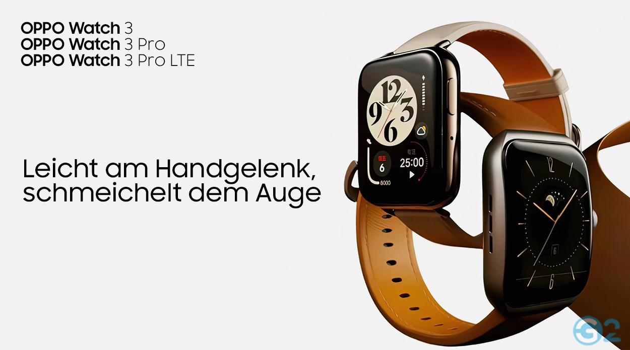 Auf dem Bild sehen wir vermutlich die Oppo Watch 3 und 3 Pro. Die eine mit – die andere ohne Krone, von der vermutet wird das diese auch eine Funktion für die Menüwahl haben wird. Zusätzlich scheint das Pro-Modell mit einem leicht gewölbten Edelstahl-Gehäuse zu erscheinen. Als dritte Variante vermuten wir ein entsprechendes LTE-Modell. Mit Sicherheit wird es noch ein paar Informationen vor dem Launch am 10. August geben.