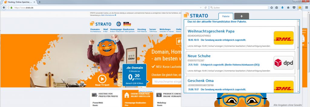 Dieses System nutzen alle der fünf größten Paketdienste in Deutschland. Die Vorteile, die das Strato Addon mit sich bringt, sind allerdings besonders User freundlich: Anstatt auf die Seiten unterschiedlicher Paketdienste zu surfen und den Status für jedes Paket einzeln abrufen zu müssen, kann man das mit dem neuen Tool über eine einzige Abfrage erledigen. Man muss sich nicht ständig fragen, welches Paket mit welchem Zusteller unterwegs ist oder um was für ein Päckchen es sich eigentlich handelt. Denn über das Addon können mehrere Sendungen gleichzeitig gespeichert und verfolgt werden. Zudem kann jedem Auftrag ein Kommentar wie „Geschenk für die Eltern“ oder „Kleidung“ hinzugefügt werden. Da das Tool eine Erweiterung für den Browser ist, erübrigt sich auch das viele Klicken durch unzählige Seiten. Mit der Installation hat man nämlich sofort ein kleines Paket-Icon neben der Adresszeile des Browsers.
