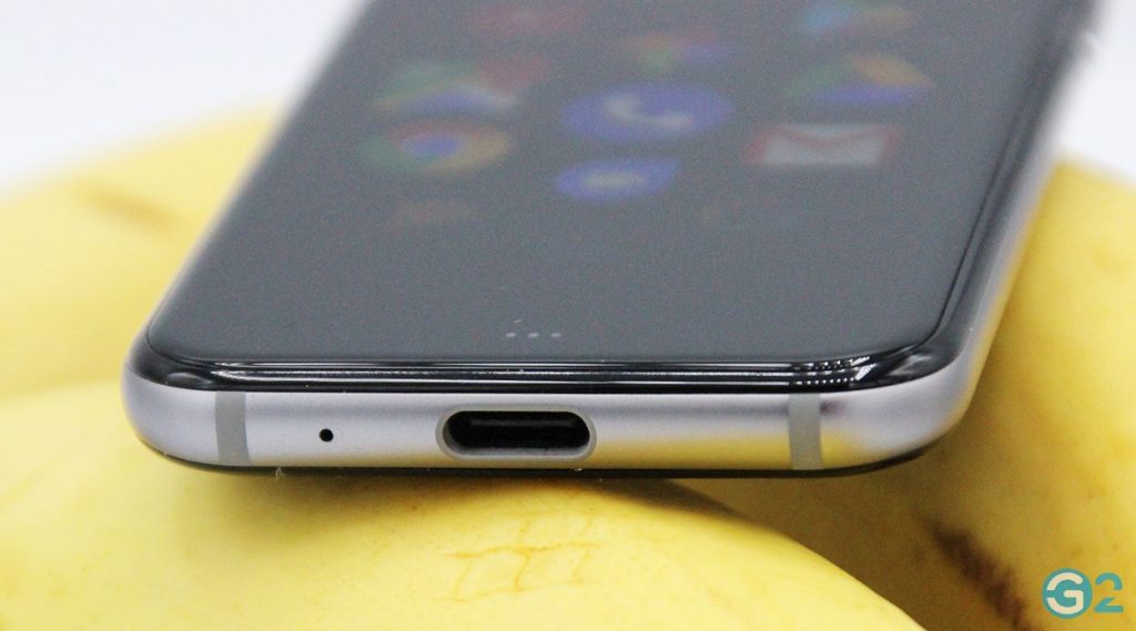 Der Palm ist aufgrund seiner Größe von 96,6 x 50,6 x 7,4 Millimeter und einem Gewicht von 62,5 Gramm nahezu spartanisch ausgestattet. Auf der Unterseite befindet sich lediglich ein USB-Class-C-Port und eine Öffnung wohinter sich ein Mikrofon befindet. Keine Öffnungen für einen Lautsprecher und auch kein 3,5 Millimeter großer Klinkenanschluss für Stereo-Kopfhörer oder ein Headset.
