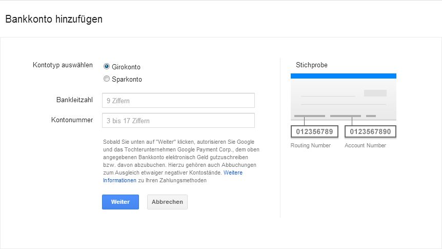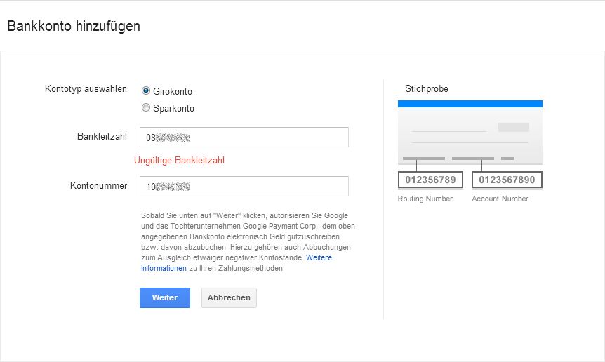 Und demnächst wird Google über Google Wallet für den play Store eine weitere Bezahlmöglichkeit anbieten, welche sich Android-Nutzer in Deutschland mindestens seit 2008 bereits wünschen: Bankeinzug vom Giro- oder Sparkonto. Die Funktion selbst ist in der Übersicht der Zahlungsmittel des Google Wallet vorhanden. Über das Dropdown-Menü „Zahlungsmethode hinzufügen“ kann neuerdings entweder eine Kreditkarte oder ein Bankkonto hinzugefügt werden. Zumindest theoretisch, denn die 8-stelligen deutschen Bankleitzahlen werden derzeit noch nicht von Google Wallet angenommen. Selbst eine vorangestellte Null, wie es die Banken selbst unterstützen, funktioniert nicht und resultiert in einer „Ungültigen Bankleitzahl“, wie in den Bildern zu sehen.